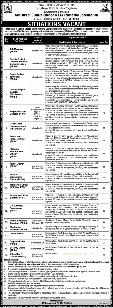 MOCC seeks applications from Pakistani National qualified and eligible individuals for multiple positions in PSDP Project – Upscaling of Green Pakistan Programme on purely contract basis for two years extendable subject to satisfactory performance.