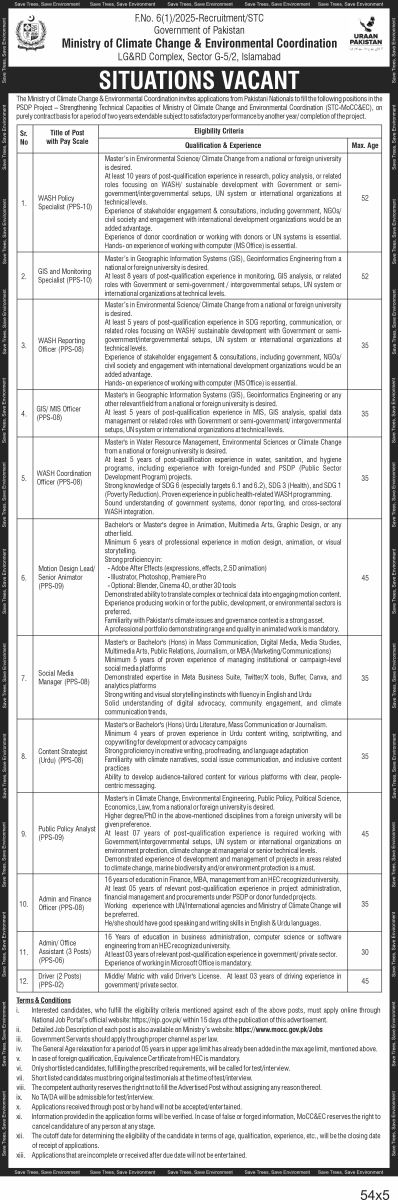 Career Opportunities at Ministry of Climate Change (MOCC) Islamabad || Oct-2025