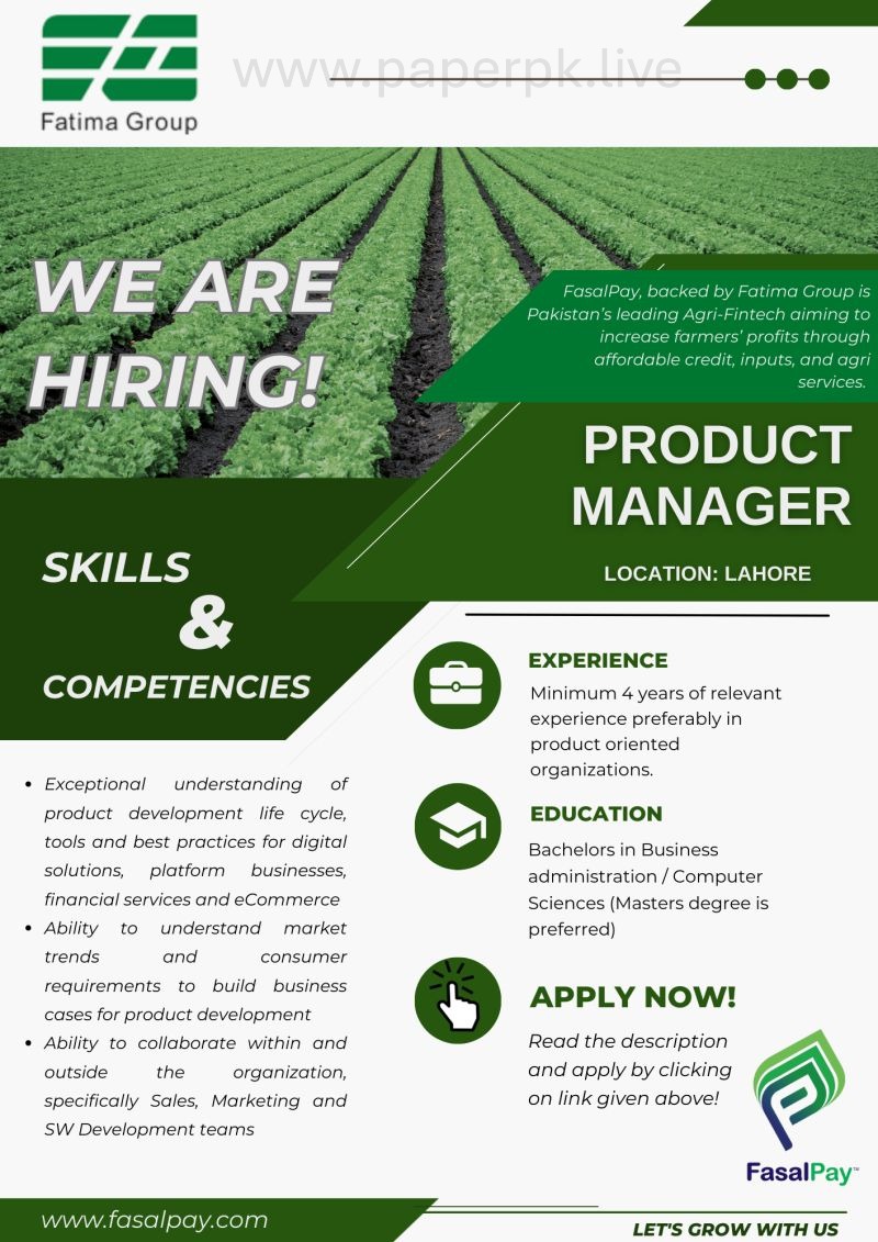 Fatima Group is looking for the services of qualified and self-motivated professional for the position of “Product Manager” for it Fintech initiative FasalPay.