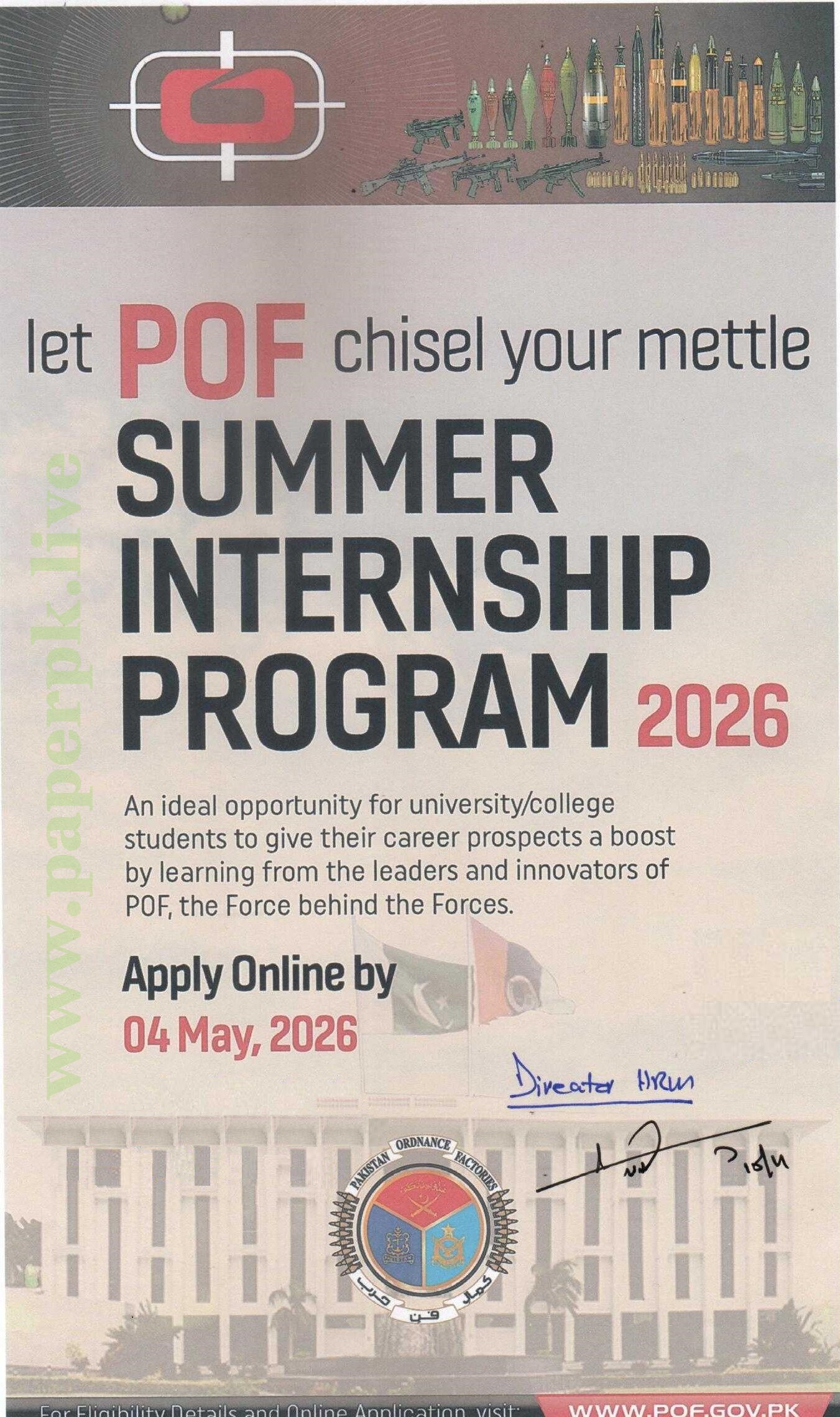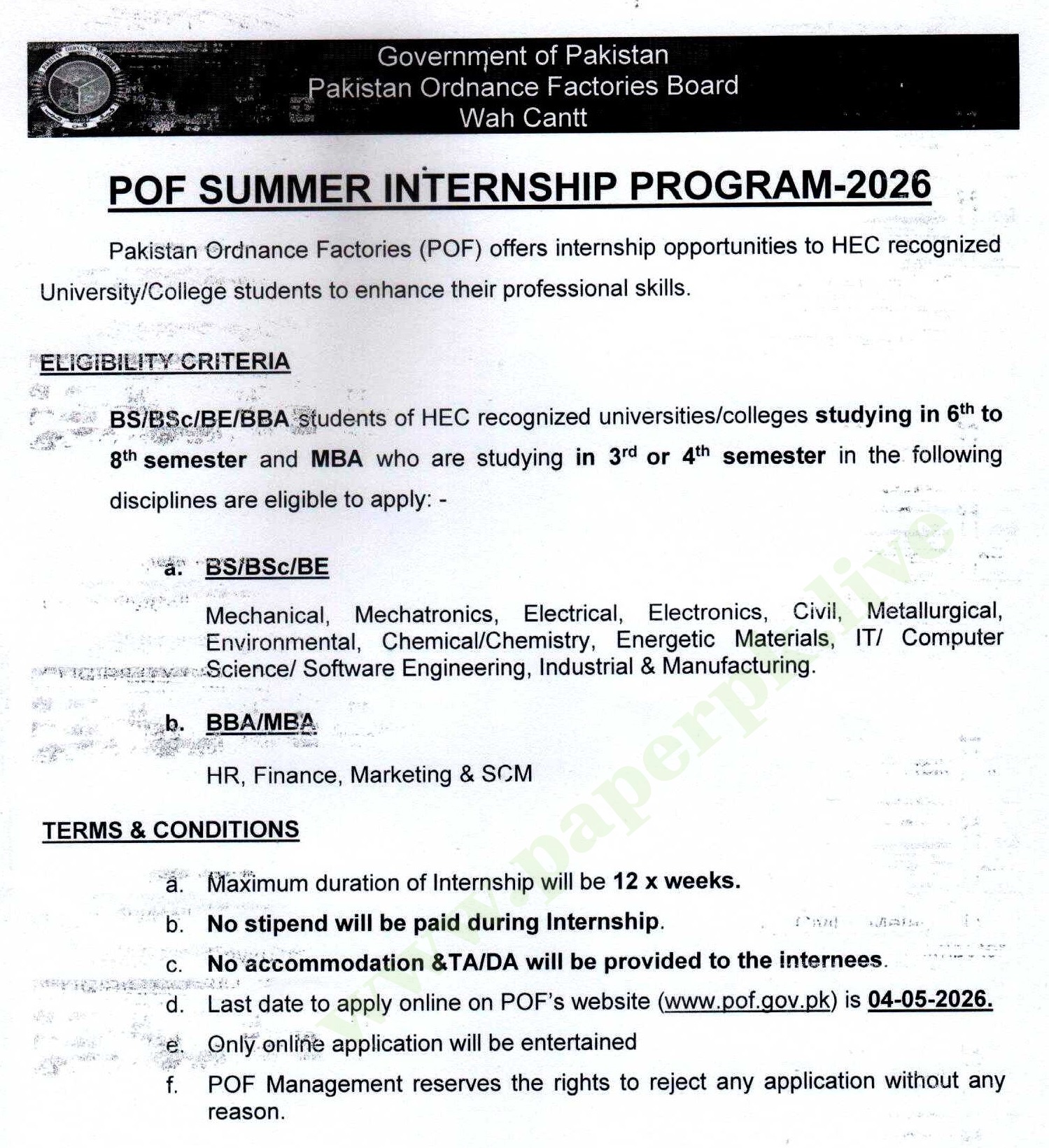 Internship Opportunities at Pakistan Ordnance Factories (POF) Wah Cantt || Apr-2026