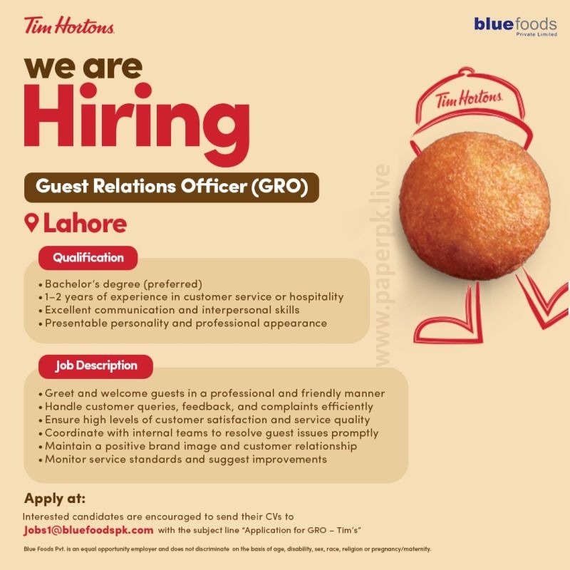 Tim Hortons Pakistan is looking for dynamic, energetic and self-motivated professional for the role of Guest Relations Officer at Lahore.