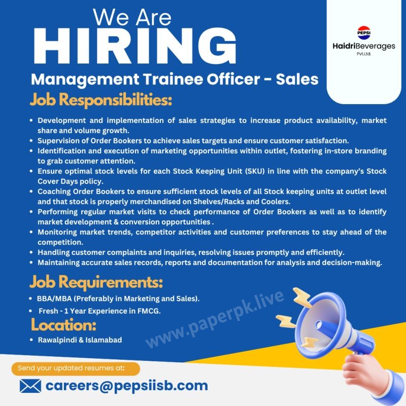 Haidri Beverages (Pepsi-Cola) Hiring “Management Trainee Officer – Sales” at Islamabad || Mar-2026