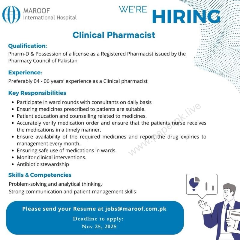 Job Opportunity at Maroof Hospital: Hiring “Clinical Pharmacist” at Islamabad || Nov-2025