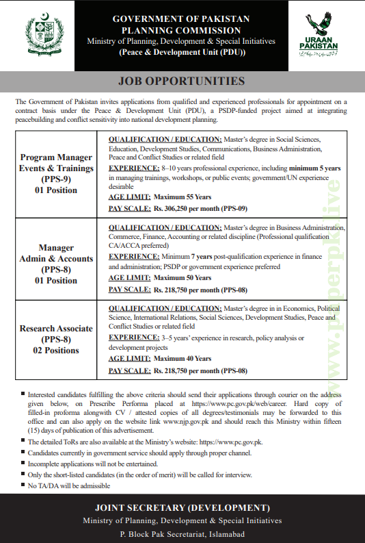The Government of Pakistan invites applications from qualified and experienced professionals for the appointment on a contract basis under the Peace & Development Unit (PDU), a PSDP-funded project aimed at integrating peacebuilding and conflict sensitivity into national development planning.