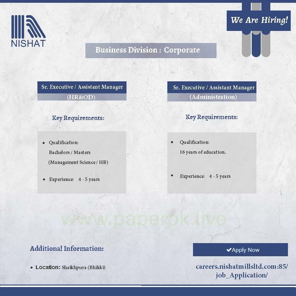 Job Opportunities at Nishat Mills: Hiring for HR and Administration Positions || Nov-2025