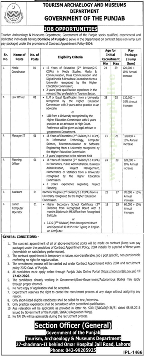 Tourism, Archaeology & Museums Department, Government of the Punjab seeks qualified, experienced and dedicated individuals having Domicile of Punjab to serve in the department on contract basis under the provisions of Contract Appointment Policy – 2004.
