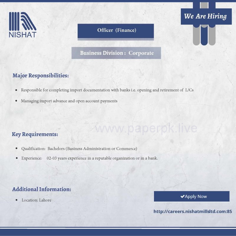 Nishat Mills is looking for dynamic and self motivated individuals for the positions of Officer Finance at Lahore.