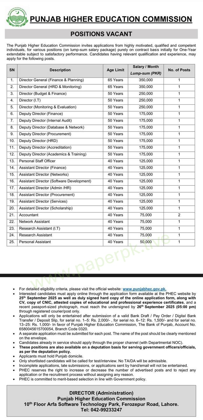 - Application will only be entertained after receiving the valid Bank Draft / Pay Order / Deposit Slip for the post of Director General, Director Rs. 2000/-, for the post of Deputy Director Rs. 1500/-, for the post of Personal Staff Officer, Assistant Director, Accountant, Network Assistant, Research Assistant Rs. 1000/- for the vacant positions advertised at PHEC in favor of Punjab Higher Education Commission, The Bank of Punjab Account No. 6580045615700054 branch code 0320.